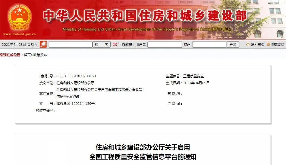 住建部:5月15日起,正式啟用全國工程質(zhì)量安全監(jiān)管信息平臺(tái)!